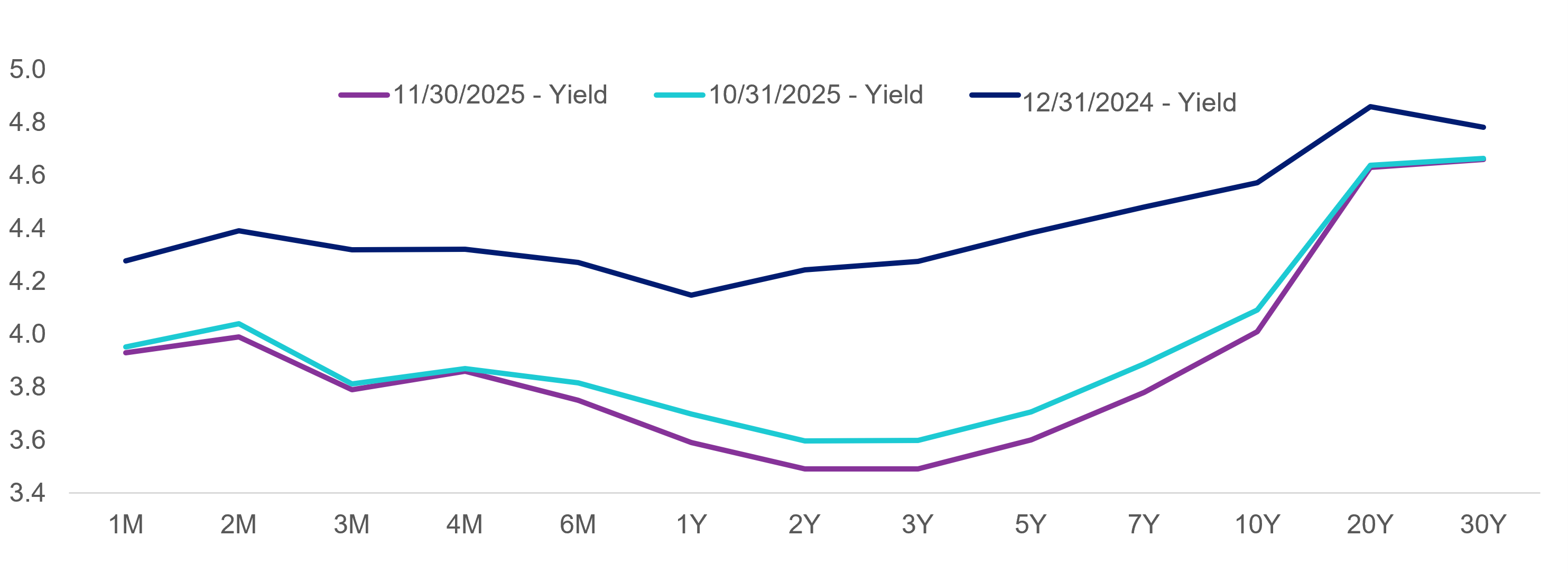 Markets were volatile during the month, with declines driven by concerns over high-tech valuations, followed by a rebound with the end of the government shutdown. U.S. equity market valuations are at historic highs, with both trailing and forward P/E ratios ahead of longer-term averages. Market headlines continue to be focused on technology sector concentration, AI debt needs and Bitcoin sell-off.